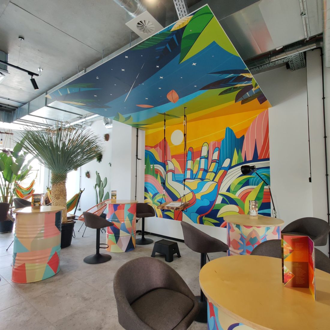 W restauracji Nowy Ląd zrealizowaliśmy bardzo kolorowy, dynamiczny mural.