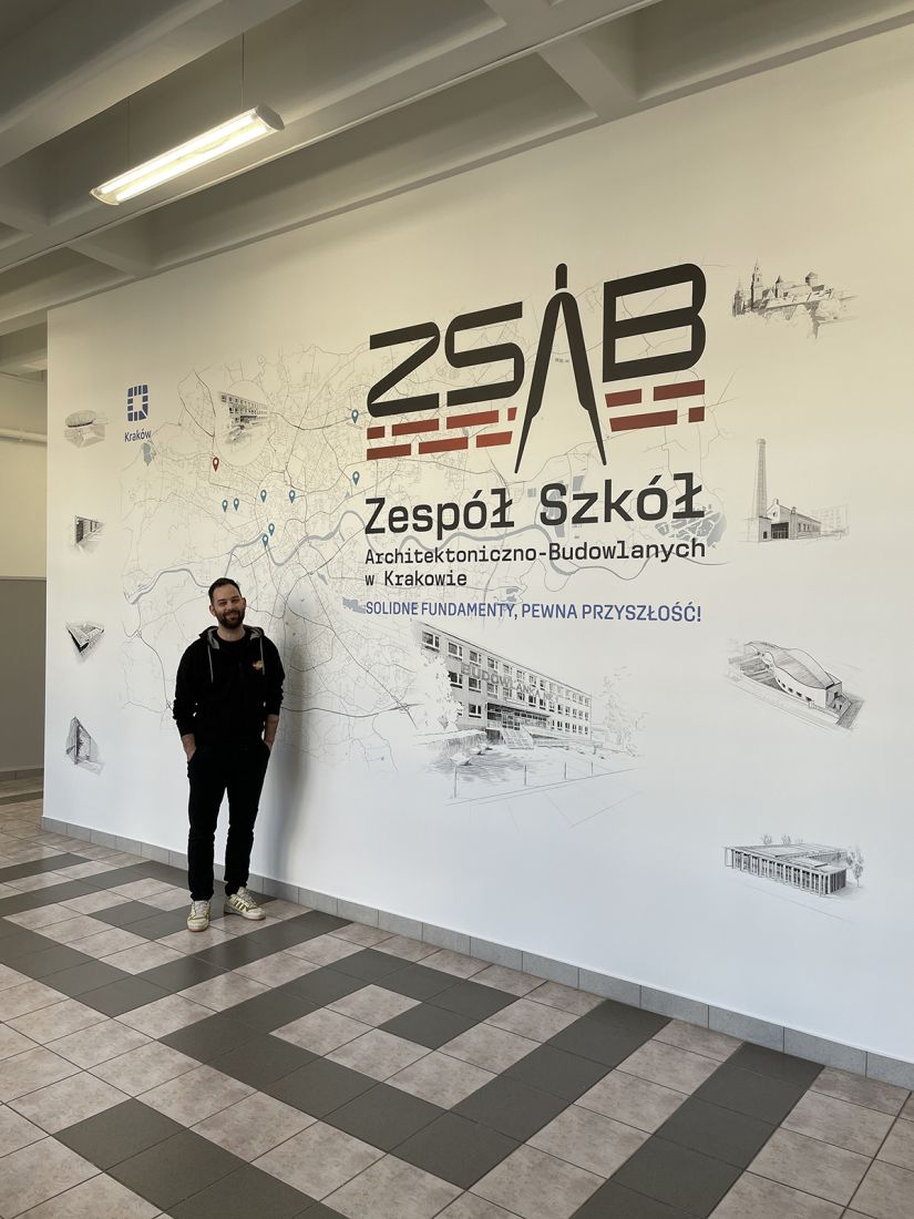 ZSAB to szkoła architektoniczno-budowlana, więc tu poprzeczka była zawieszona wysoko. Drukowaliśmy ogromną mapę Krakowa oraz grafiki z najciekawszymi budynkami miasta. Wszystko w formie szkicowej, minimalistycznej, z dbałością o każdy detal. Uczniowie – przyszli architekci – codziennie mijają te ściany. Fajnie, prawda?